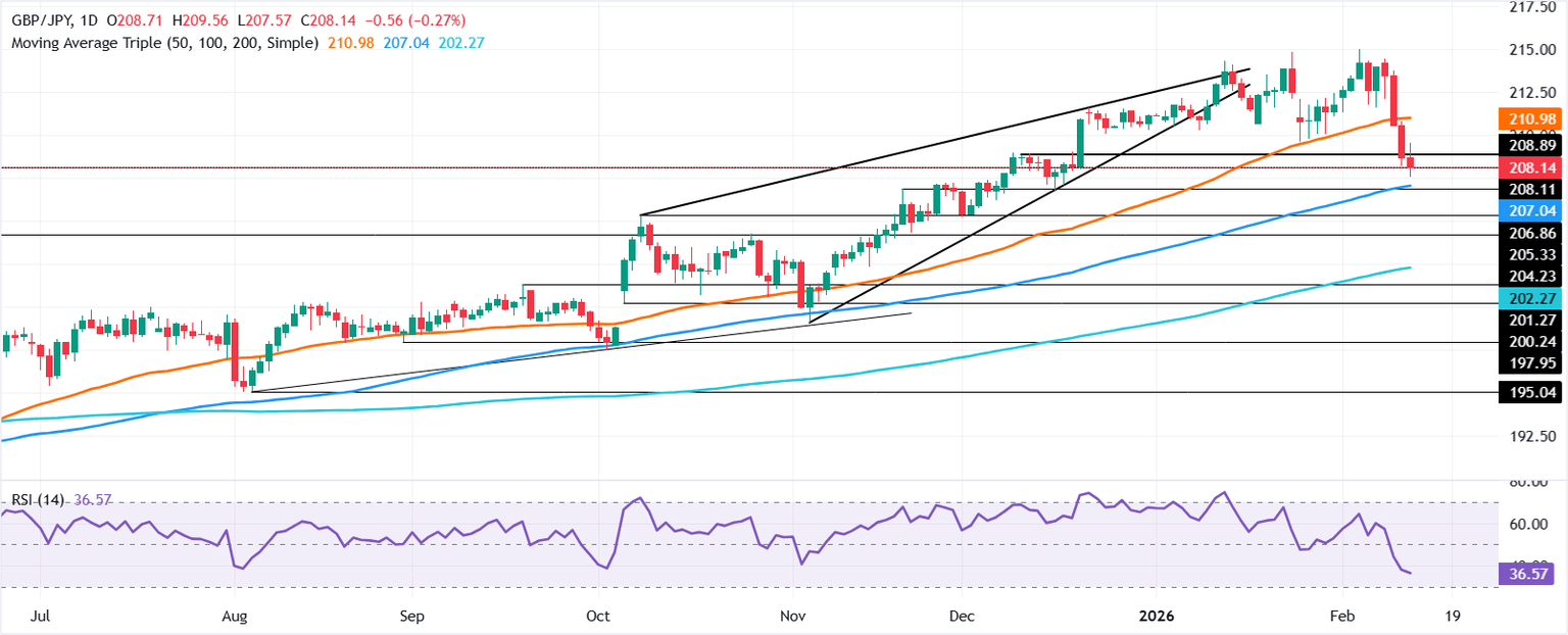 La Libra esterlina se desplomó el jueves, cayendo un 0.36% en el día, ya que la aversión al riesgo aumentó el atractivo de refugio seguro del Yen japonés. Los renovados temores de disrupción de IA enviaron a Wall Street a la baja, mientras que activos refugio como el Oro, la Plata y el Dólar estadounidense no lograron ganar tracción. Al momento de escribir, el GBP/JPY cotiza en 209.09 después de alcanzar un máximo diario de 209.55.
