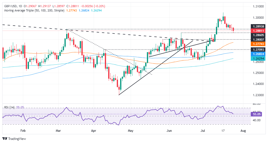 - El GBP/USD cae a 1.2881, marcando el tercer día de pérdidas, después de alcanzar un máximo de 1.2913.