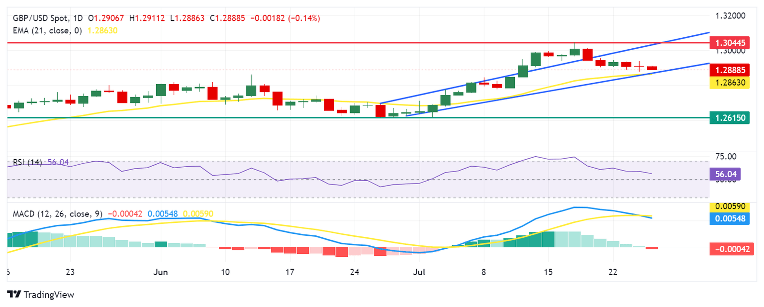 - El GBP/USD podría probar el límite inferior del canal ascendente y la EMA de 21 días en el nivel de 1.2863.