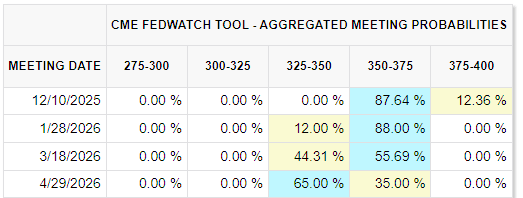 Las expectativas de recorte de tasas de interés de la Reserva Federal (Fed) se están extendiendo en una piscina desordenada de cara al final del año. Los mercados de tasas aún valoran casi un 90% de probabilidades de un tercer recorte de tasas consecutivo el 10 de diciembre. Sin embargo, los operadores de tasas también están valorando un 88% de probabilidades de que la Fed se mantenga firme en diciembre y entregue un recorte de un cuarto de punto en enero.