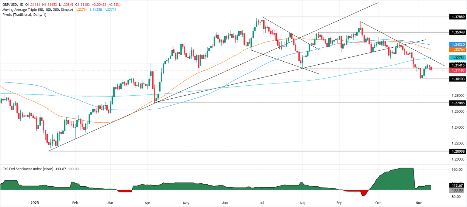 La imagen técnica del GBP/USD sigue teniendo un sesgo a la baja, aunque los vendedores necesitan arrastrar el tipo de cambio por debajo de 1.3100 para desafiar el último mínimo del ciclo de 1.3010, alcanzado el 5 de noviembre. Una ruptura de esos dos niveles podría exponer el mínimo del 7 de abril de 1.2707.