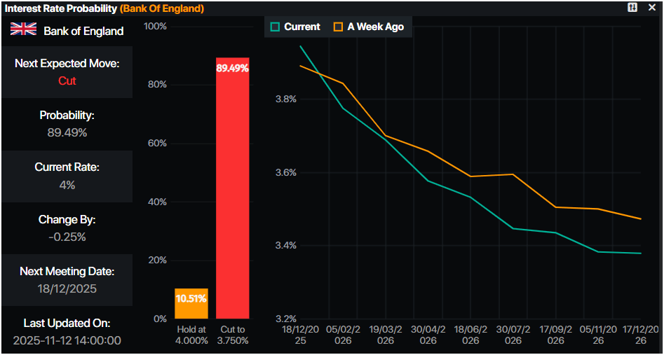 Además de eso, un informe de empleo más débil revelado el martes aumentó las posibilidades de un recorte de tasas del Banco de Inglaterra (BoE) en diciembre. En la última reunión, el Gobernador del BoE, Andrew Bailey, se alineó con los halcones en una votación de 5-4. Sin embargo, el aumento de la Tasa de Desempleo al 5% y la desaceleración del crecimiento salarial llevaron a los operadores a descontar un recorte de 25 puntos básicos por parte del BoE en la reunión de diciembre, con probabilidades cercanas al 90%, según datos de Prime Market Terminal.