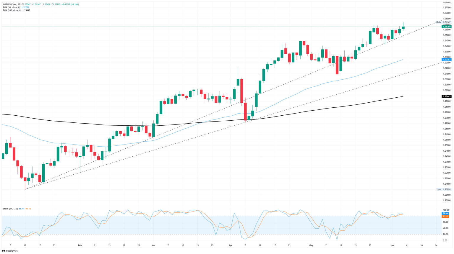 El GBP/USD probó sus ofertas más altas en más de tres años el jueves, subiendo brevemente por encima de la zona de 1.3600 en el comercio intradía por primera vez en 40 meses. Sin embargo, el impulso alcista sigue siendo tibio, ya que el sentimiento de los inversores se ve obstaculizado por la inminente publicación de los datos de Nóminas no Agrícolas (NFP) de EE.UU. que se publicarán el viernes, así como por un rápido y creciente enfrentamiento entre el presidente de EE.UU., Donald Trump, y su (ahora ex) mano derecha, Elon Musk.