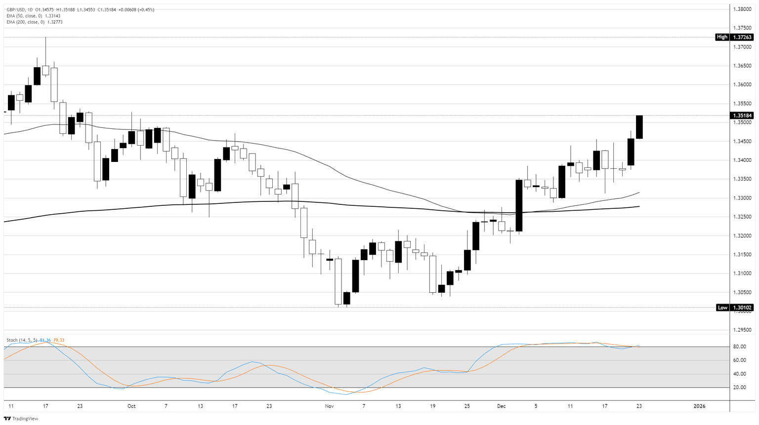 El GBP/USD subió aproximadamente un 0.45% el martes, apoyado por una disminución general en los flujos del Dólar estadounidense (USD) a nivel global. El sentimiento de los inversores es positivo a medida que nos acercamos a la mitad de una semana acortada por las festividades, con el Dólar presionado por las expectativas de un mayor alivio por parte de la Reserva Federal (Fed) hasta 2026.