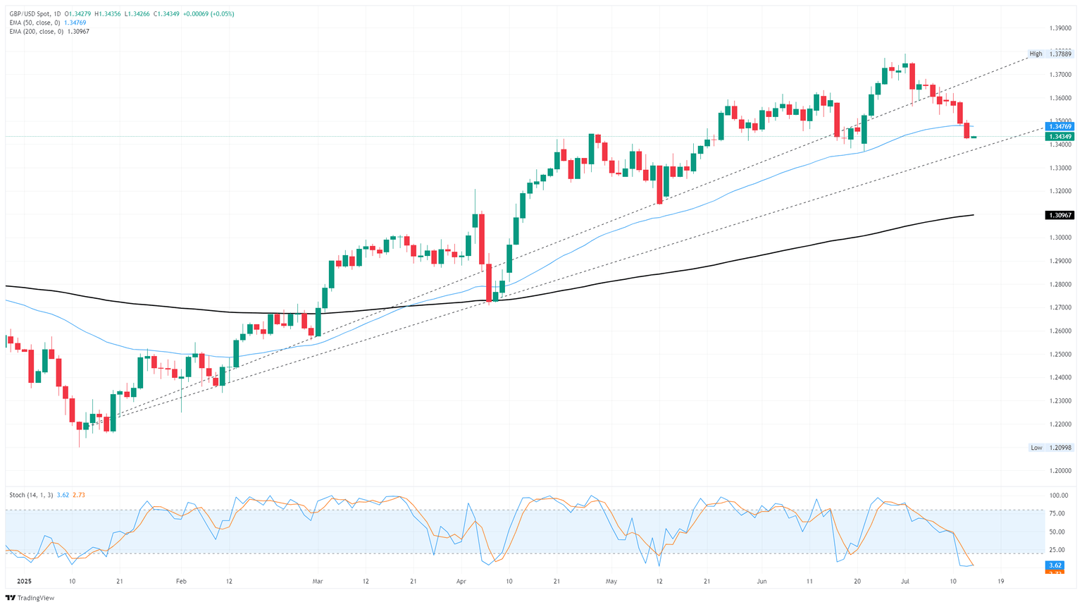 El GBP/USD se hundió aún más el lunes, cerrando a la baja por séptima sesión de mercado consecutiva y cayendo por debajo de la media móvil exponencial (EMA) de 50 días por primera vez desde mediados de abril. Los mercados esperan que la última ronda de amenazas arancelarias del presidente estadounidense Donald Trump termine con otro retraso o una suspensión, pero los datos económicos negativos del Reino Unido, así como un nivel general de inquietud para los inversores, están manteniendo a raya el apetito por el riesgo y fortaleciendo el refugio seguro que representa el Dólar estadounidense.