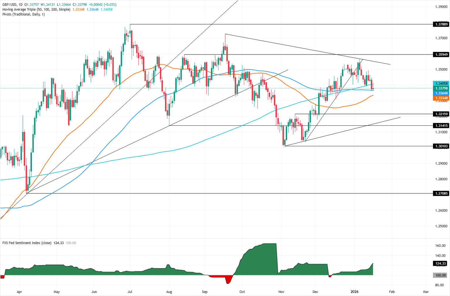 A corto plazo, el GBP/USD se ha vuelto bajista después de que una línea de tendencia de soporte trazada desde los mínimos de finales de noviembre se rompiera el 6 de enero. Desde entonces, el par se consolidó brevemente por encima de la SMA de 200 días en 1.3405, antes de caer por debajo de esta a nuevos mínimos anuales de 1.3366.