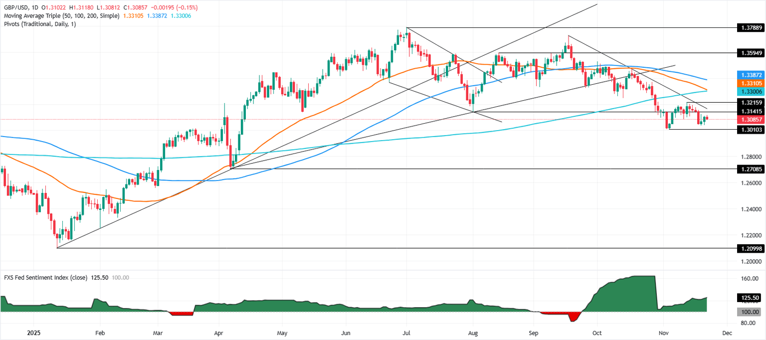 El par GBP/USD se mantiene subdued el lunes durante la sesión norteamericana, cotizando sin cambios en torno a 1.3088 mientras los operadores esperan la publicación del presupuesto del Reino Unido en una semana acortada debido al Día de Acción de Gracias en EE.UU.