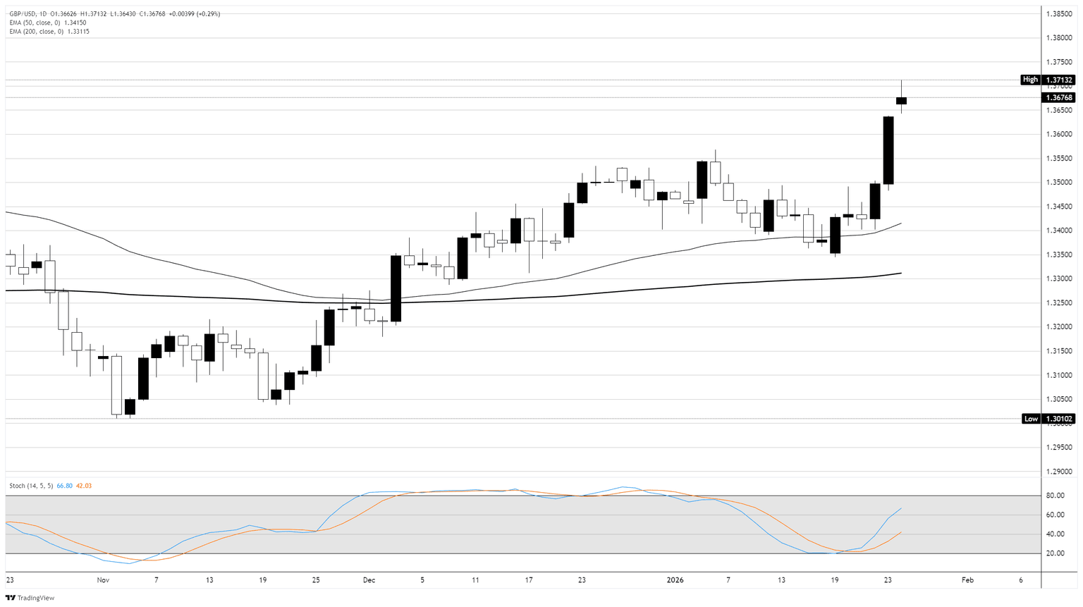 El GBP/USD está bien encaminado hacia territorio de sobrecompra, alcanzando un máximo de cuatro meses el lunes en la zona de 1.3700 y marcando un fuerte desempeño en enero a medida que el Dólar estadounidense continúa debilitándose. Se necesitará una caída considerable para empujar las ofertas del Cable de regreso a la zona media, con la media móvil exponencial (EMA) de 50 días languideciendo cerca de la región de 1.3400.