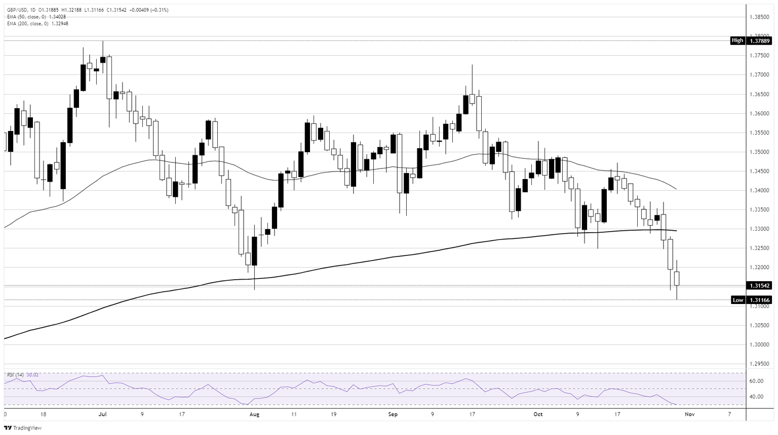 El GBP/USD cayó nuevamente el jueves, descendiendo hacia la zona de 1.3100 y tocando mínimos de seis meses en 1.3116. La Libra Esterlina (GBP) continúa perdiendo valor frente al Dólar estadounidense (USD), y ha caído más del 2% frente al Dólar en el mes de octubre.