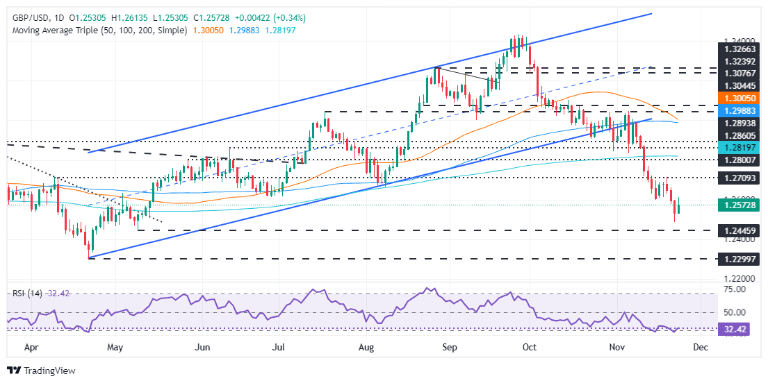 A pesar de registrar ganancias, el GBP/USD sigue sesgado a la baja después de caer por debajo de la Media Móvil Simple (SMA) de 200 días en 1.2818. Si los compradores quieren recuperar el control, necesitan conquistar la cifra de 1.2600, seguida de una ruptura clara del pico del 21 de noviembre en 1.2659, lo que podría exacerbar un rally hacia 1.2700. Con una mayor fortaleza, la SMA de 200 días es la siguiente.