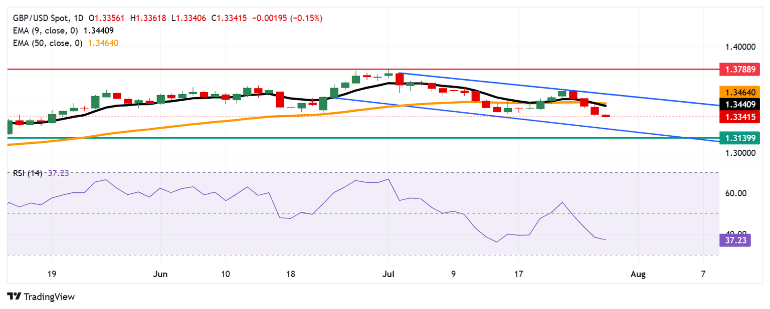 El par GBP/USD extiende su racha de pérdidas por cuarta sesión consecutiva, cotizando alrededor de 1.3340 durante las horas asiáticas del martes. El sesgo bajista prevalece ya que el análisis técnico del gráfico diario sugiere que el par se mantiene dentro del patrón de canal descendente.