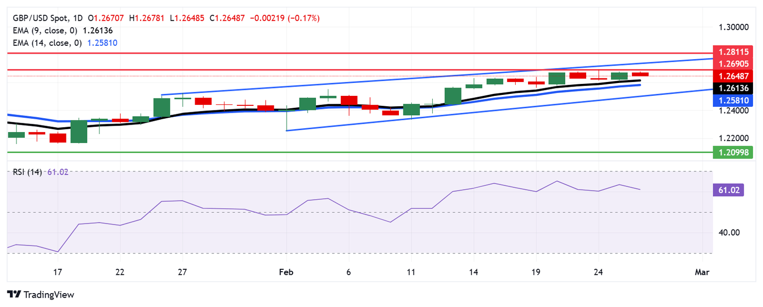El par GBP/USD cede parte de sus recientes ganancias de la sesión anterior, oscilando alrededor de 1.2650 durante la sesión asiática del miércoles. A pesar de este retroceso, el análisis técnico del gráfico diario indica una perspectiva alcista sostenida, ya que el par se mantiene dentro de un patrón de canal ascendente.