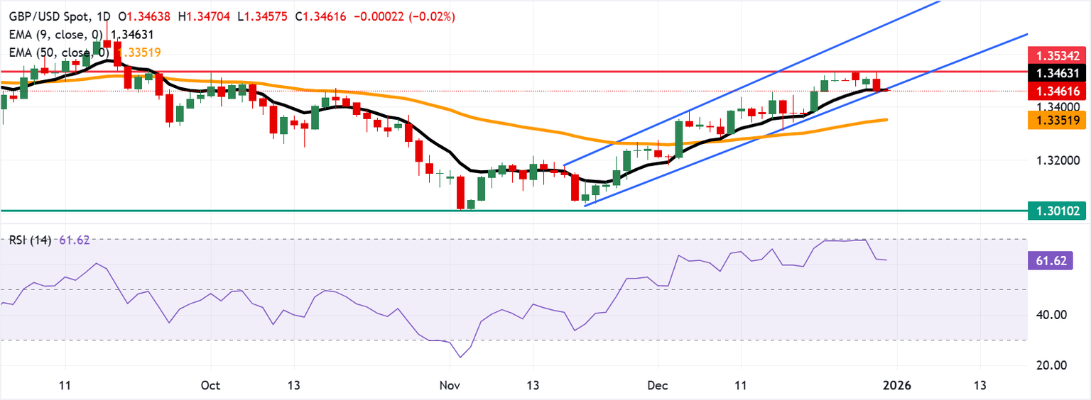 El GBP/USD permanece moderado por segundo día consecutivo, cotizando alrededor de 1.3460 durante las horas asiáticas del miércoles. El análisis técnico del gráfico diario indica un debilitamiento del sesgo alcista, ya que el par se posiciona ligeramente por debajo del límite inferior del patrón de canal ascendente.