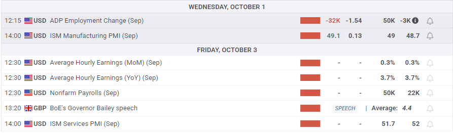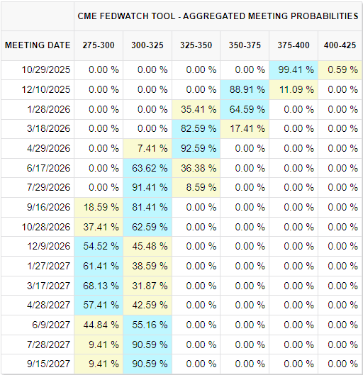 Con la impresión del NFP en peligro, los inversores se están apoyando aún más en datos privados como ADP. Según la herramienta FedWatch del CME, las apuestas de los operadores de tasas de otro recorte de tasas de interés de un cuarto de punto el 29 de octubre se dispararon al 99% después de ADP el miércoles. Los mercados de tasas también están valorando casi un 90% de probabilidades de un tercer recorte de tasas consecutivo el 10 de diciembre, y un 93% adicional de que la Fed entregará un cuarto recorte de tasas de interés a más tardar el próximo abril.