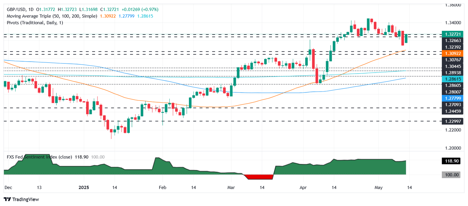 La tendencia alcista del GBP/USD se mantiene intacta a pesar de retroceder por debajo de la media móvil simple (SMA) de 20 días en 1.3301, que ahora sirve como el próximo nivel de resistencia potencial. A corto plazo, el momentum ha cambiado positivamente, como lo indica el Índice de Fuerza Relativa (RSI). Por lo tanto, el par podría extender sus ganancias.
