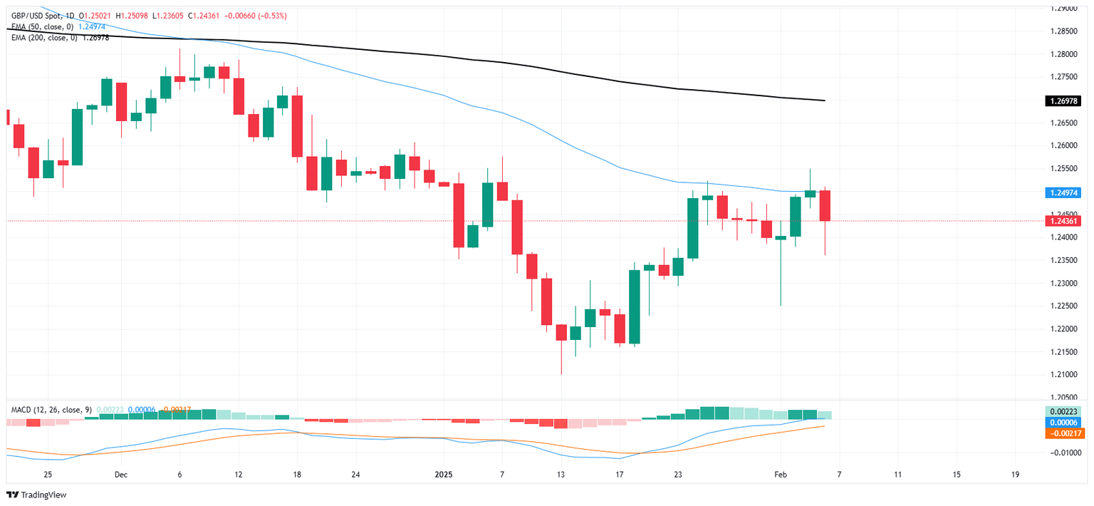 El retroceso bajista del jueves vio al GBP/USD registrar un rechazo técnico de la media móvil exponencial (EMA) de 50 días, tocando un mínimo intradía cerca de 1.2350. El par cerró el día un poco al sur de 1.2450, pero podría haber más impulso bajista en juego mientras los alcistas luchan por mantener el impulso.
