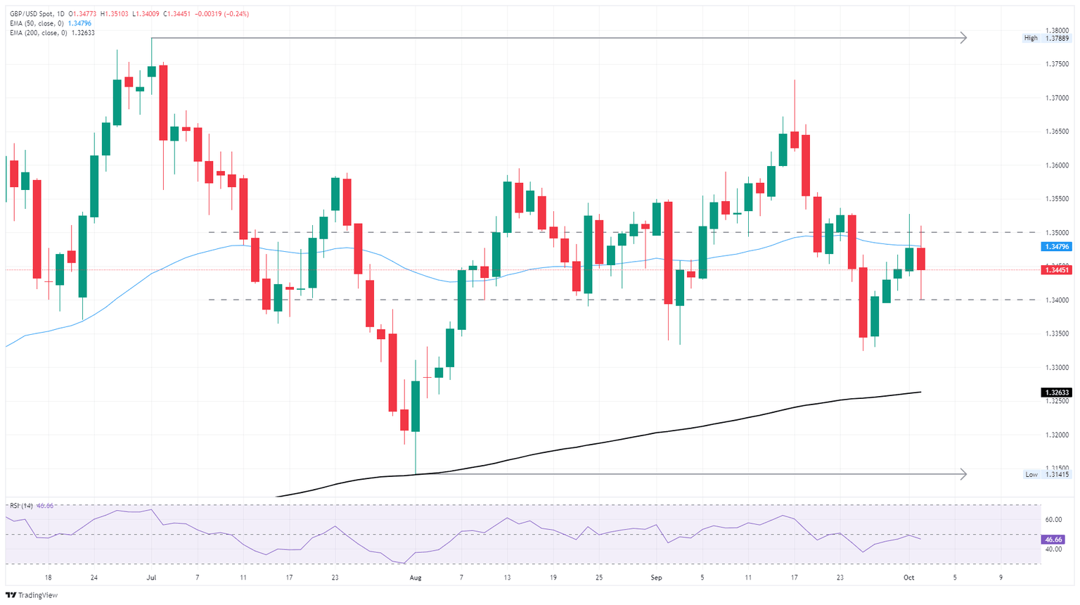 El GBP/USD retrocedió el jueves, interrumpiendo una racha de cuatro sesiones de ganancias y cayendo de nuevo tras un rechazo técnico en la zona de 1.3500. El Cable está volviendo a una consolidación a medio plazo de 1.3400 a 1.3500 y la acción del precio se mantiene obstinadamente justo por debajo de la media móvil exponencial de 50 días. Los mercados están tomando una pausa prolongada en el impulso mientras los inversores sopesan cuánto tiempo durará el cierre federal del gobierno de EE.UU. y cuáles podrían ser los impactos económicos.