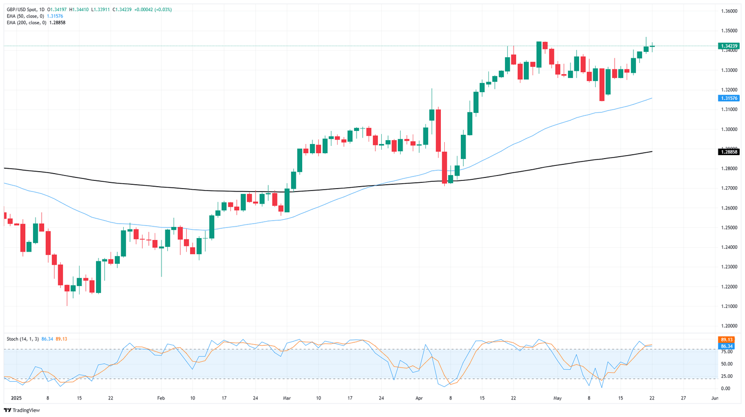 El GBP/USD se mantuvo estable el jueves, marcando un círculo ajustado justo al norte de la zona de 1.3400 mientras el sentimiento del mercado global sufre efectos colaterales de una reciente ola de preocupación que afectó a los rendimientos del Tesoro esta semana. Los inversores se centran en los crecientes problemas de deuda de Estados Unidos (EE.UU.), que están a punto de recibir una nueva inyección (en la dirección equivocada) a medida que el proyecto de ley fiscal y presupuestaria "grande y hermosa" del presidente Donald Trump avanza en el Congreso.
