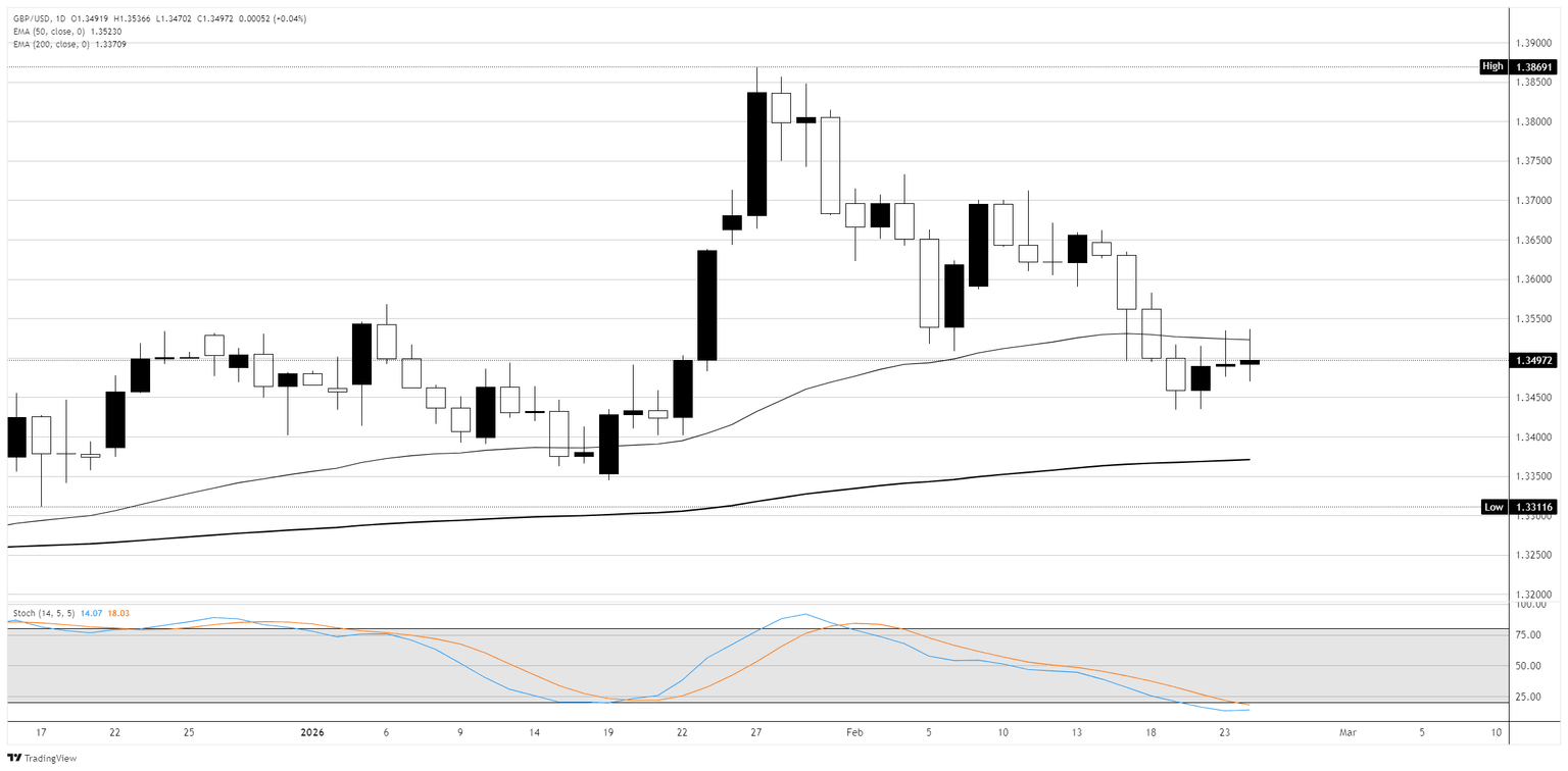El GBP/USD estuvo esencialmente plano el martes, oscilando alrededor de 1.3500 en una sesión tranquila. El par se ha retirado bruscamente de su máximo a finales de enero cerca de 1.3870 y ahora se está consolidando en un rango estrecho alrededor de la Media Móvil Exponencial (EMA) de 50 días, con un grupo de velas mixtas en las últimas dos semanas sugiriendo indecisión tras la venta masiva.