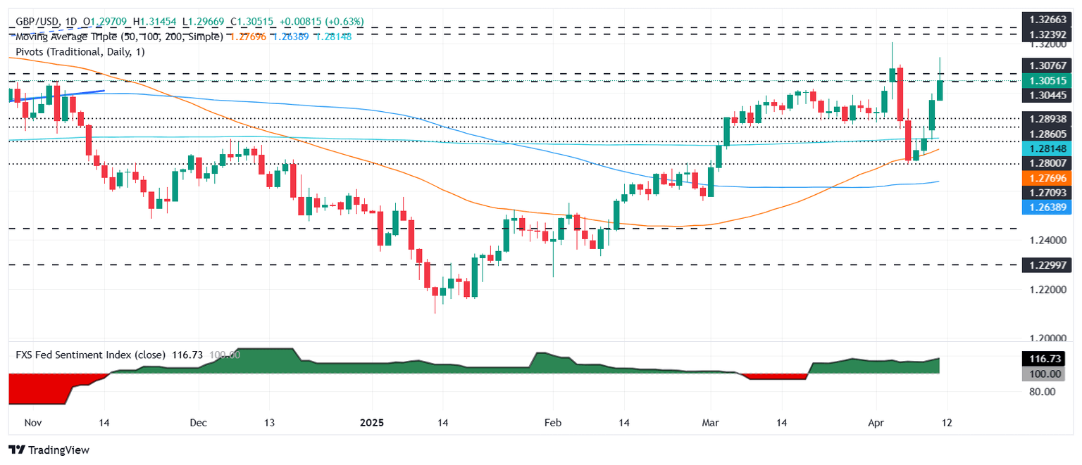La Libra esterlina (GBP) extiende sus ganancias frente al Dólar estadounidense (USD) a medida que la guerra comercial entre EE.UU. y China se intensifica, con Pekín imponiendo aranceles del 125% a los productos estadounidenses. Las políticas comerciales continúan impulsando la acción de precios, con datos económicos en un segundo plano. Al momento de escribir, el GBP/USD cotiza en 1.3067, un aumento del 0.77%.