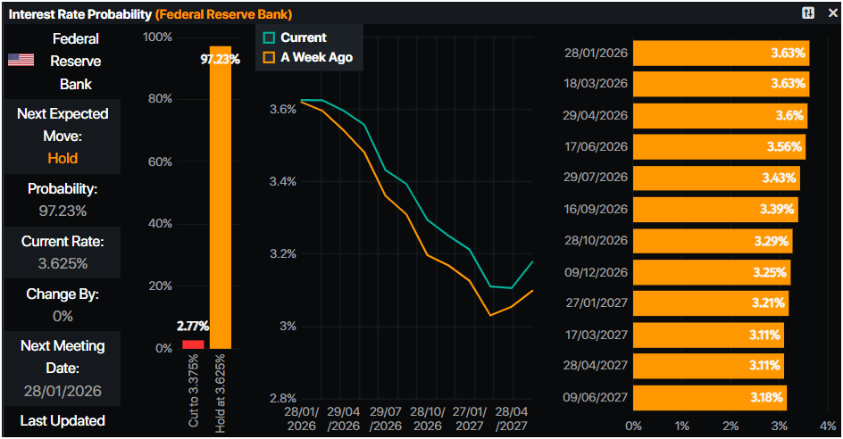 - Los mercados descartan un recorte de la Fed en enero a pesar de datos más suaves en medio de tensiones políticas en torno al liderazgo de la Fed.
