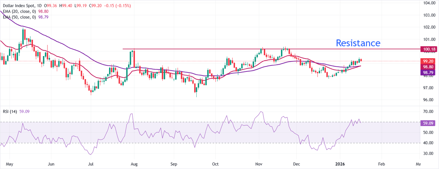 En el gráfico diario, el Índice del Dólar Spot se negocia a 99.20. El precio se mantiene por encima de la media móvil exponencial (EMA) de 20 días en 98.80 y la EMA de 50 días en 98.79, con estas medias actuando como soportes inmediatos. La EMA de 20 días sube marginalmente por encima de la EMA de 50 días, reforzando un sesgo positivo a corto plazo.