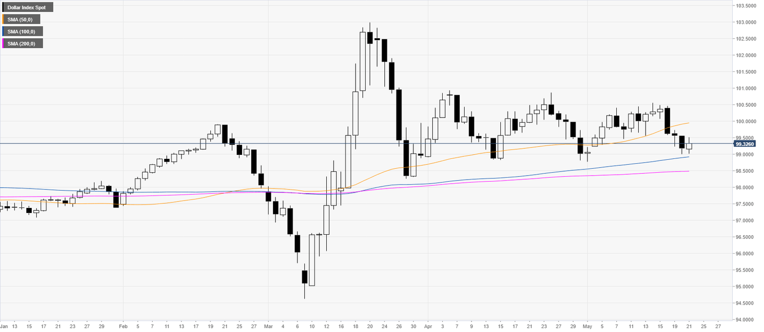El índice del dólar estadounidense (DXY) cotiza cerca de los mínimos de mayo por debajo de la SMA de 50 en el gráfico diario después de registrar su peor caída diaria en 5 semanas este lunes.