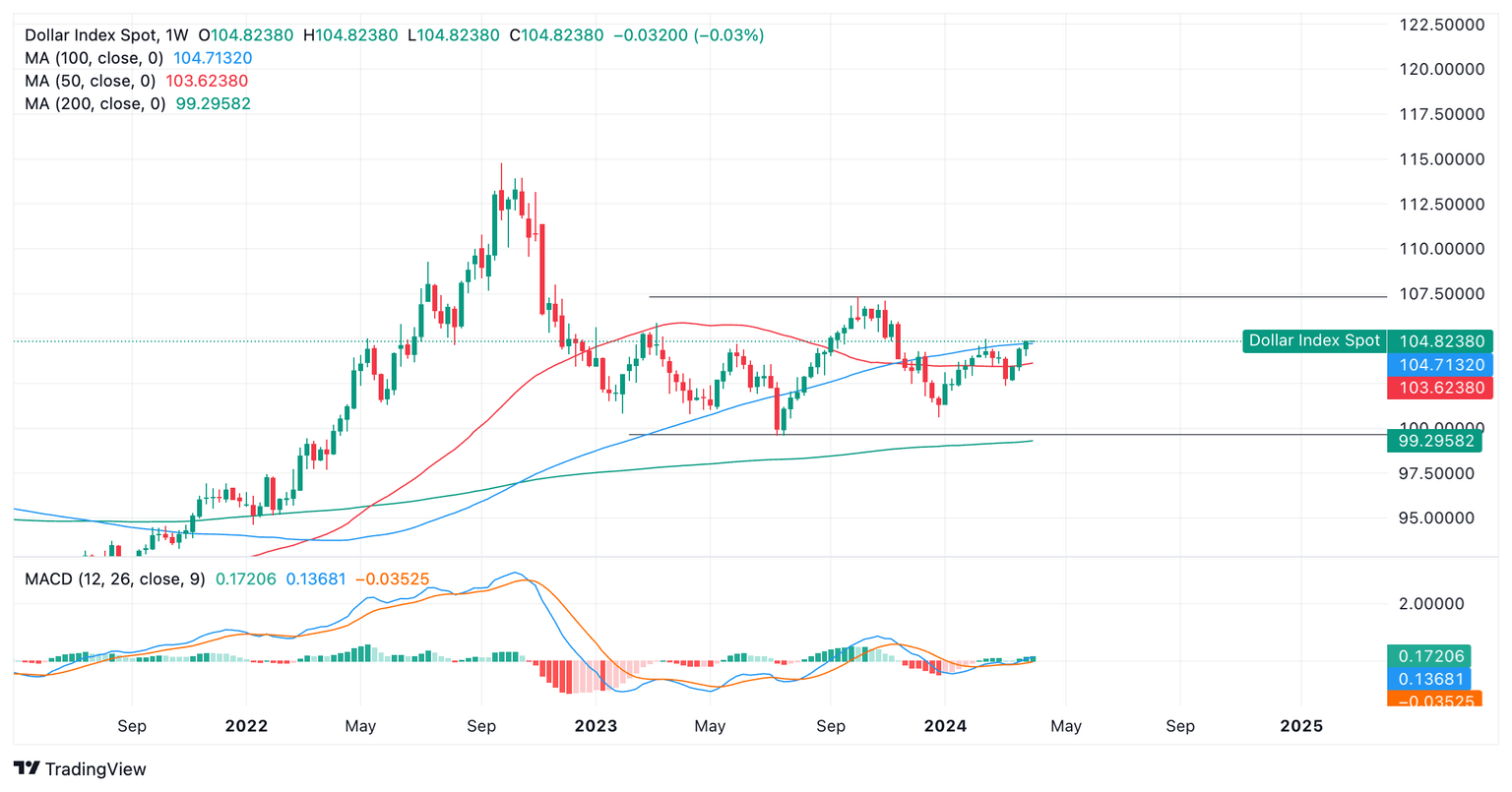Dentro de su rango de consolidación, actualmente está encontrando resistencia tras subir hasta la media móvil simple (SMA) de 100 semanas en 104.71 puntos.
