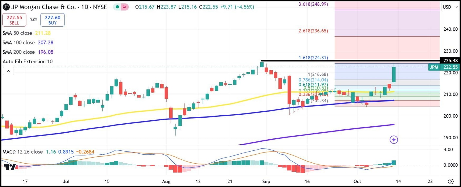 Las acciones de JPMorgan están cerca de alcanzar un nuevo máximo histórico. El existente se alcanzó el 30 de agosto en 225.48 $, y las acciones de JPM estaban a menos de un dólar de alcanzarlo anteriormente en la sesión.
