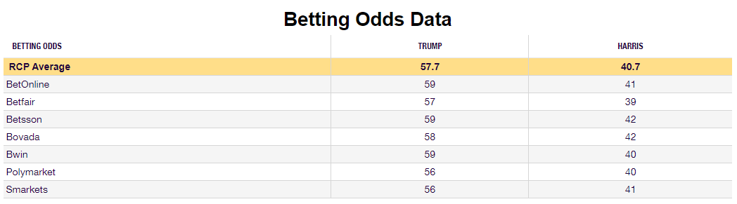 Aunque las probabilidades de apuestas de la elección presidencial de EE.UU. no deben tomarse como una visión representativa de los votantes estadounidenses, aún podrían desencadenar una reacción en los mercados financieros. A diferencia de PredictIt, el promedio de RealClearPolling para las probabilidades de apuestas actualmente tiene a Trump con una ventaja cómoda sobre Harris, 57,7 vs 40,7.
