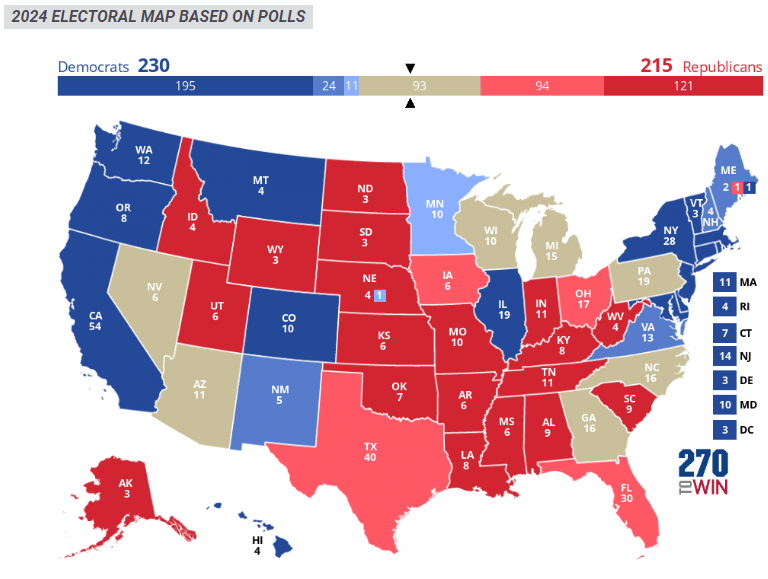 Mientras tanto, las encuestas electorales apuntan a una carrera mucho más reñida de lo que sugieren las probabilidades de apuestas. La encuesta TIPP tiene a Trump y Harris empatados en 48 a nivel nacional, la encuesta Ipsos tiene a Harris liderando por dos puntos, 50 vs 48, y la encuesta Atlas Intel tiene a Trump con una ventaja de un punto, 50 vs 49, según RealClearPolling. En algunos estados clave, como Arizona y Carolina del Norte, Trump parece mantenerse en la cima, mientras que Harris parece haber cerrado la brecha en otros, como Nevada, Georgia y Pensilvania.