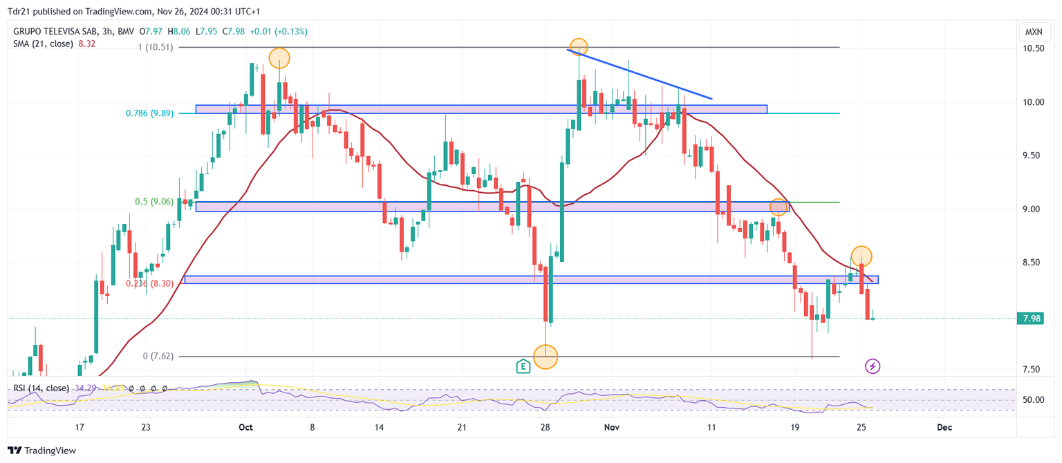 TLEVISA/CPO reaccionó a la baja en una resistencia de corto plazo dada por el máximo del 22 de noviembre en 8.55 pesos mexicanos, cercano al retroceso del 23.6% de Fibonacci. La siguiente resistencia clave la observamos en 8.97 pesos mexicanos, en convergencia con el retroceso al 50% de Fibonacci. Al sur, la zona clave de soporte se encuentra en 7.59 pesos mexicanos, dada por el mínimo del 20 de noviembre.