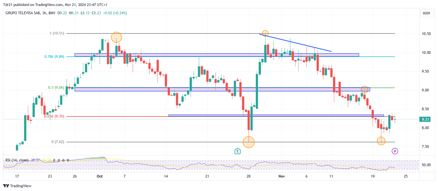 TLEVISACPO reaccionó al alza en un soporte clave dado por el mínimo del 20 de noviembre en 7.59 pesos mexicanos. Al alza, la resistencia más cercana se ubica en 8.97 pesos mexicanos, en convergencia con el retroceso al 50% de Fibonacci. La siguiente zona de resistencia clave está en 10.50 pesos mexicanos, punto pivote del 30 de octubre.
