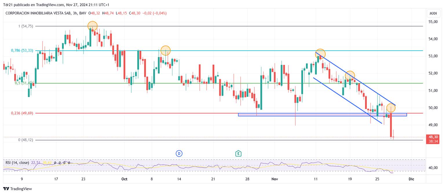 VESTA una resistencia de corto plazo dada por el máximo del 11 de noviembre en 53.08 pesos mexicanos, la siguiente resistencia clave la observamos en 54.73 pesos mexicanos máximo del 24 de septiembre. Al sur, el soporte clave se encuentra en 47.30 pesos mexicanos, punto pivote del 12 de enero de 2023.