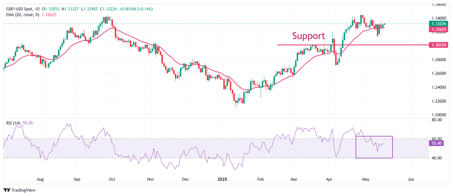 La Libra esterlina enfrenta presión por encima de 1.3300 frente al Dólar estadounidense el viernes. Aún así, el par GBP/USD se mantiene por encima de la media móvil exponencial (EMA) de 20 días, que cotiza alrededor de 1.3256, lo que sugiere que la tendencia a corto plazo es alcista.