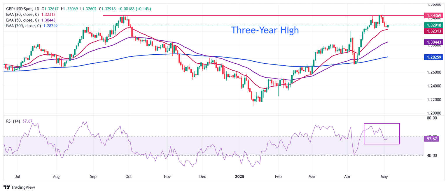 La Libra esterlina (GBP) lucha por extender su alza por encima del máximo intradía de 1.3330 frente al Dólar estadounidense (USD) durante las horas de negociación en América del Norte el lunes. El GBP/USD enfrenta presión a medida que el Dólar estadounidense (USD) rebota tras la publicación de los datos del PMI de servicios del ISM de Estados Unidos (EE.UU.) para abril, que mostraron que las actividades en el sector servicios crecieron inesperadamente a un ritmo más rápido de lo esperado. Sin embargo, el par sigue un 0.30% más alto, cerca de 1.3300, al momento de la publicación.