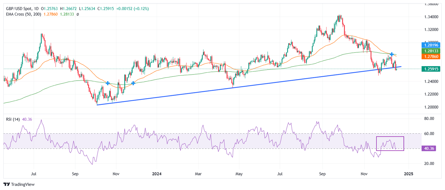 La Libra esterlina cotiza por encima de un nuevo mínimo de tres semanas cerca de 1.2555 frente al Dólar estadounidense el jueves. El par GBP/USD lucha por mantener la línea de tendencia ascendente, que se traza desde el mínimo de octubre de 2023 alrededor de 1.2035, y sigue siendo una zona de soporte clave por debajo de 1.2600.