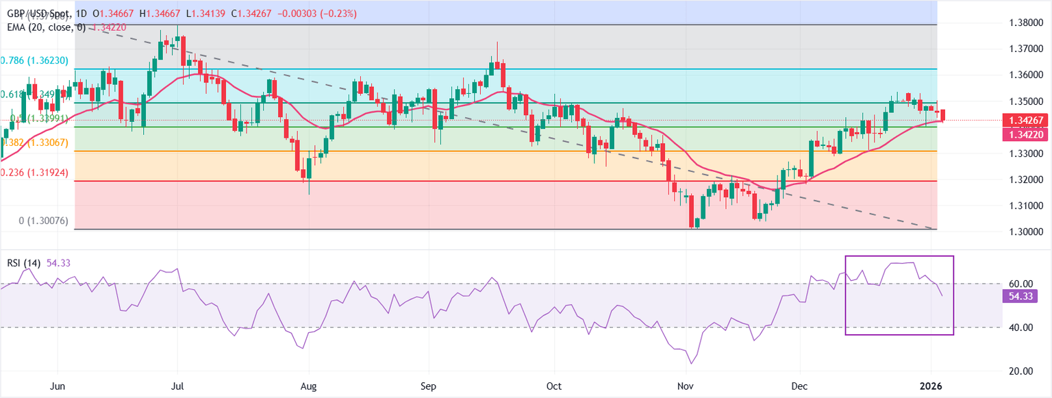 En el gráfico diario, el GBP/USD cotiza a 1.3427 en el momento de escribir. El precio se mantiene ligeramente por encima de una media móvil exponencial (EMA) de 20 días en 1.3422, manteniendo la tendencia a corto plazo apuntando al alza. La media ha avanzado de manera constante y continúa respaldando retrocesos superficiales.