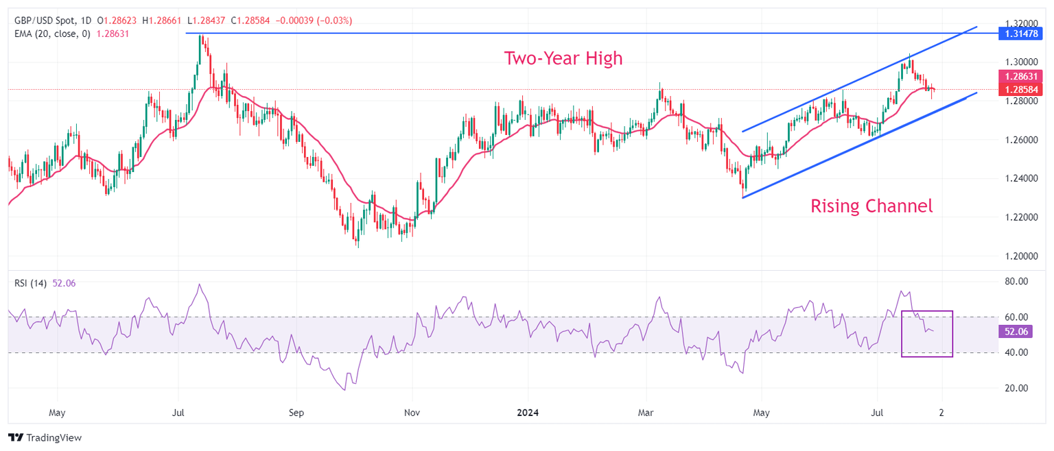 La Libra esterlina está pasando por un movimiento de reversión a la media hacia el límite inferior del patrón gráfico de canal ascendente en un marco de tiempo diario. El par GBP/USD cayó en retroceso después de romper por debajo del soporte crucial de 1.2900. El Cable cae por debajo de la media móvil exponencial (EMA) de 20 días cerca de 1.2860, lo que sugiere incertidumbre en la tendencia a corto plazo.