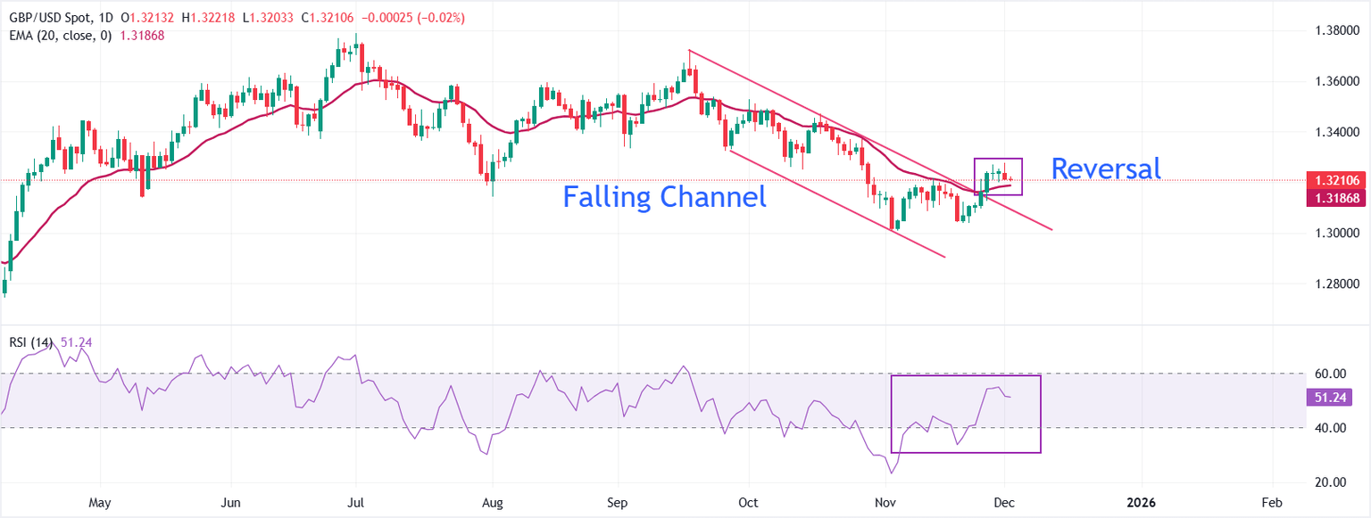 El GBP/USD cotiza a 1.3211 durante la sesión de negociación europea del martes en el gráfico diario. El par se mantiene ligeramente por encima de la media móvil exponencial (EMA) de 20 días en 1.3187, manteniendo la tendencia a corto plazo apuntando al alza. La media ha comenzado a girar hacia arriba después de una fase de aplanamiento, señalando condiciones de tendencia en mejora.