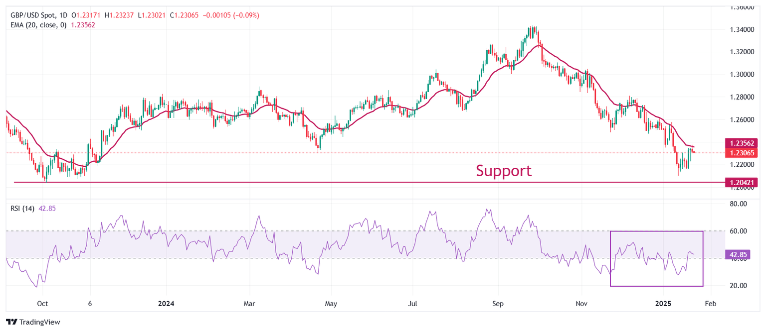 La Libra esterlina se esfuerza por romper por encima de la media móvil exponencial (EMA) de 20 días, que cotiza alrededor de 1.2356, frente al Dólar estadounidense. El par GBP/USD rebotó después de registrar un nuevo mínimo de más de un año de 1.2100 el 13 de enero.