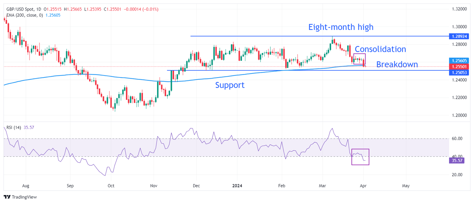 La Libra esterlina presenta un quiebre a la baja de la consolidación formada en el rango entre 1.2575 y 1.2675 la semana pasada. El cable parece vulnerable, ya que cotiza cerca de la media móvil exponencial (EMA) de 200 días en 1.2568, lo que indica una débil demanda a largo plazo.