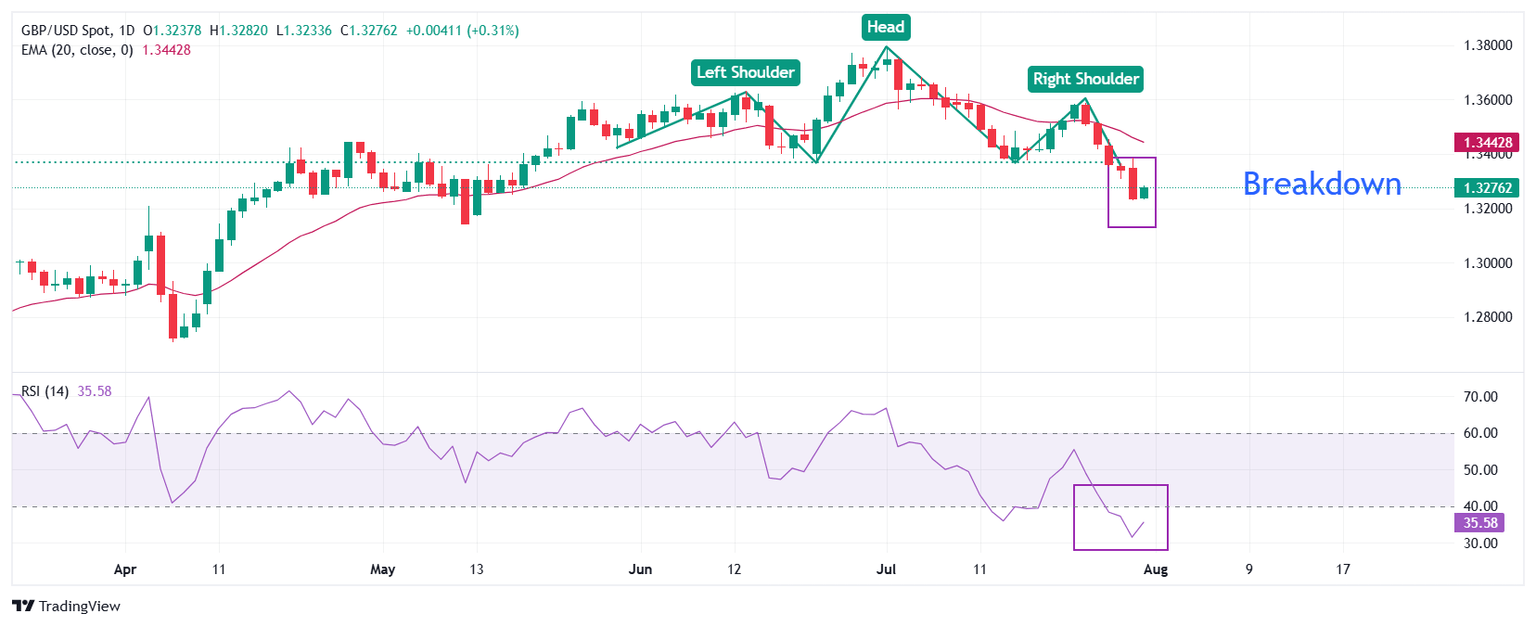 La Libra esterlina extiende su desventaja cerca de 1.3200 frente al Dólar estadounidense el jueves. Las perspectivas del par GBP/USD siguen siendo bajistas ya que ha caído por debajo de la línea de cuello de un patrón gráfico de Cabeza y Hombros (H&S) bajista. La línea de cuello de la formación H&S se traza alrededor de 1.3370.