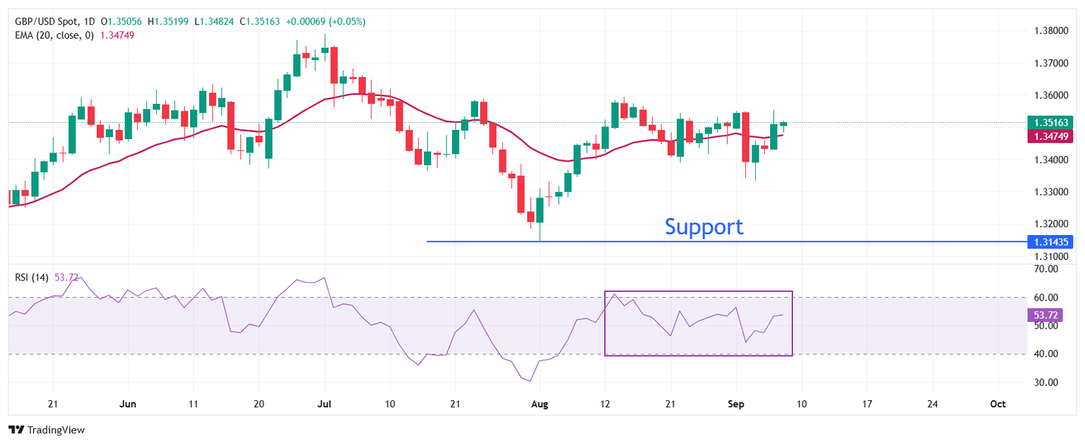 La Libra esterlina avanza ligeramente a cerca de 1.3515 frente al Dólar estadounidense el lunes, pero aún se encuentra dentro del rango de negociación del viernes. La tendencia a corto plazo del par GBP/USD es lateral mientras cotiza alrededor de la media móvil exponencial (EMA) de 20 días, que está alrededor de 1.3475.