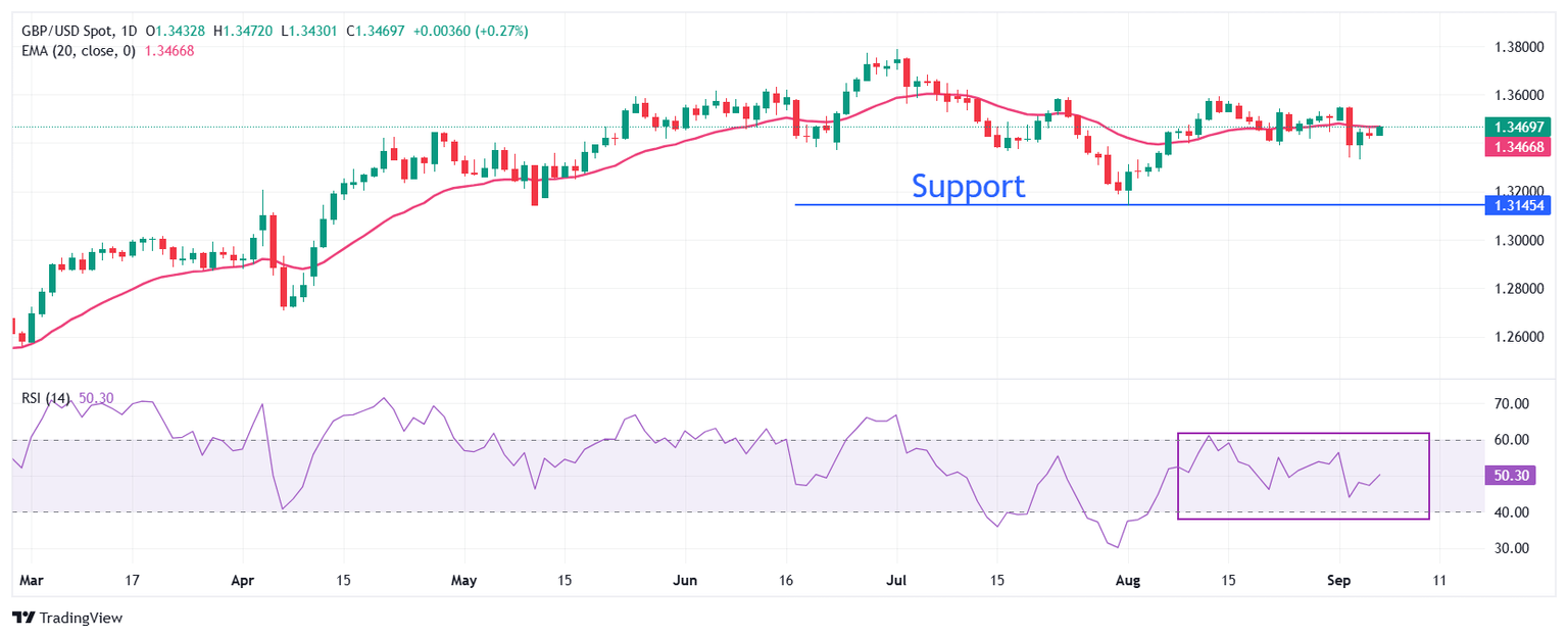 La Libra esterlina sube a cerca de 1.3470 frente al Dólar estadounidense el viernes. Sin embargo, la tendencia a corto plazo del par GBP/USD es lateral, ya que cotiza cerca de la media móvil exponencial (EMA) de 20 días, que está alrededor de 1.3470.