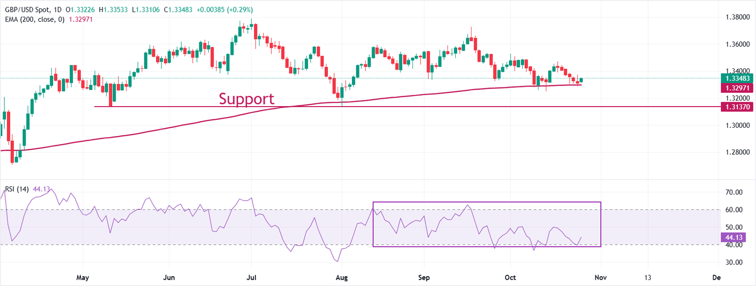 La Libra esterlina lucha por ganar terreno frente al Dólar estadounidense cerca del mínimo de 12 días alrededor de 1.3310 el lunes. La tendencia general del par GBP/USD es incierta ya que oscila cerca de la media móvil exponencial (EMA) de 200 días, que cotiza alrededor de 1.3300.