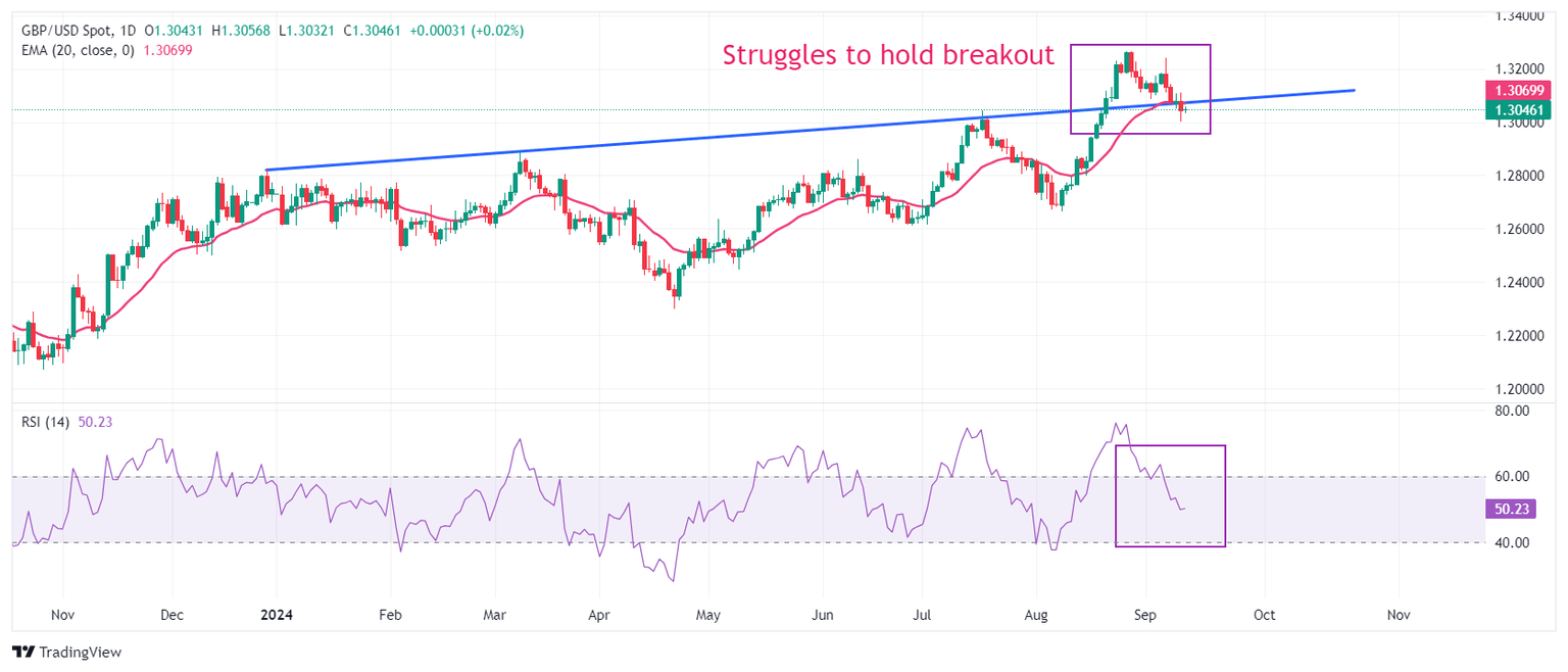 La Libra esterlina se aferra a las ganancias frente al Dólar estadounidense por encima de 1.3000. La perspectiva a corto plazo del Cable sigue siendo sombría ya que la acción del precio del par cae por debajo de la línea de tendencia trazada desde el máximo del 28 de diciembre de 2023 de 1.2828 – desde donde entregó un movimiento alcista agudo después de una ruptura el 21 de agosto. Además, un movimiento a la baja por debajo de la media móvil exponencial (EMA) de 20 días cerca de 1.3070 ha debilitado el atractivo de la Libra esterlina.