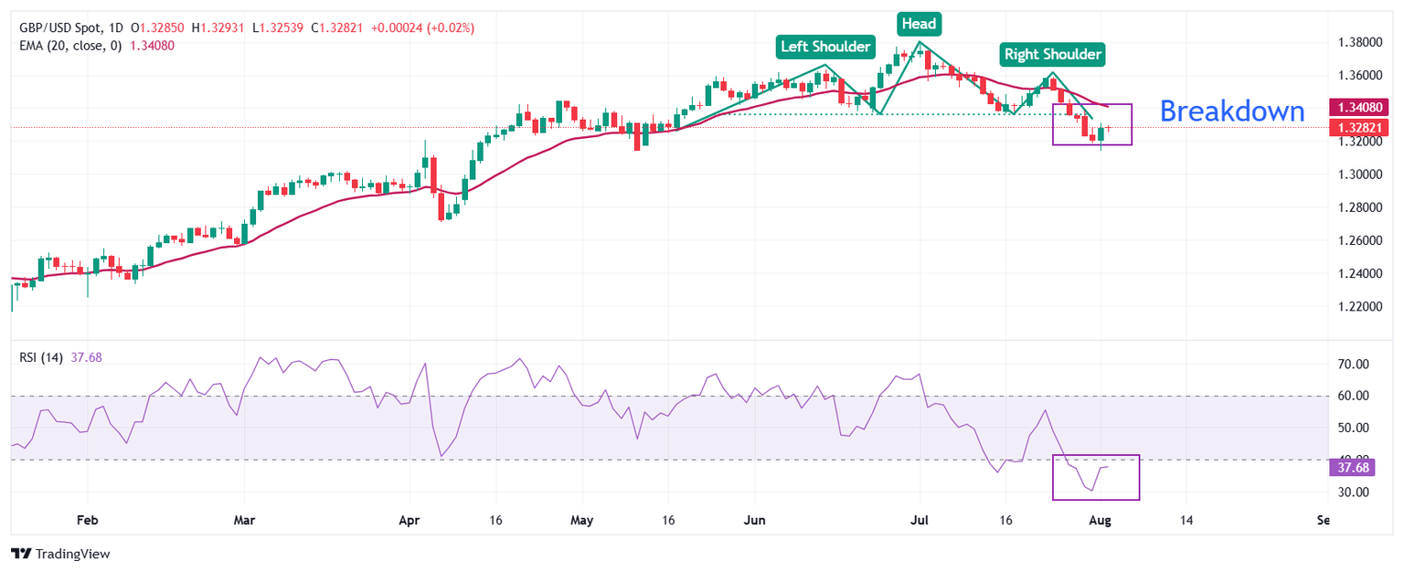 La Libra esterlina se mantiene cerca de 1.3300 frente al Dólar estadounidense el lunes. Sin embargo, la perspectiva del par sigue siendo bajista, ya que la ruptura del patrón gráfico de Hombro-Cabeza-Hombro (H&S) se mantiene intacta y la media móvil exponencial (EMA) de 20 días se inclina hacia abajo cerca de 1.3400. La línea de cuello del patrón H&S se traza alrededor de 1.3360.