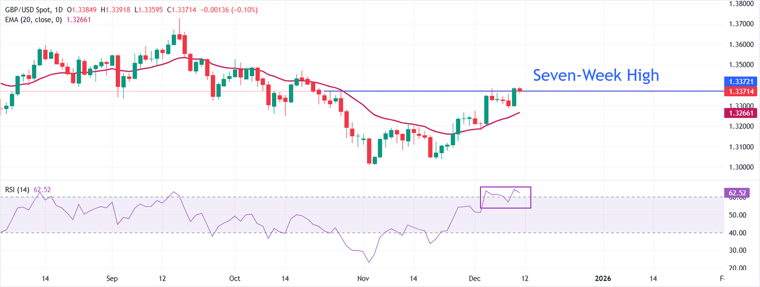 La Libra esterlina cotiza firmemente a 1.3370 frente al Dólar estadounidense el jueves. El par GBP/USD se mantiene por encima de la media móvil exponencial (EMA) de 20 días en 1.3266, que ha girado al alza y apoya la tendencia alcista. Se espera que los retrocesos encuentren demanda cerca de este nivel clave.