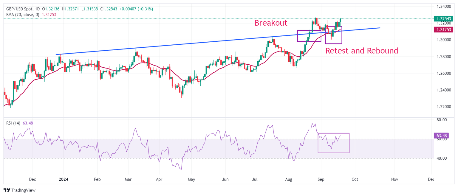 La Libra esterlina apunta a capturar 1.3300 frente al Dólar estadounidense en las horas de negociación europeas. La perspectiva a corto plazo del par GBP/USD sigue siendo firme ya que se mantiene por encima de la media móvil exponencial (EMA) de 20 días cerca de 1.3100. Anteriormente, el Cable se fortaleció después de recuperarse de un movimiento correctivo cerca de la línea de tendencia trazada desde el máximo del 28 de diciembre de 2023 de 1.2828, desde donde entregó un fuerte aumento después de una ruptura el 21 de agosto.